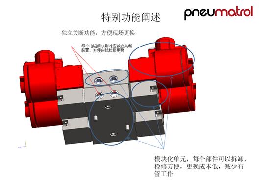 特有的4個獨立電磁閥閥位、入口及出口機械式氣壓指示器就地狀態顯示,便于現場故障排查和維護。